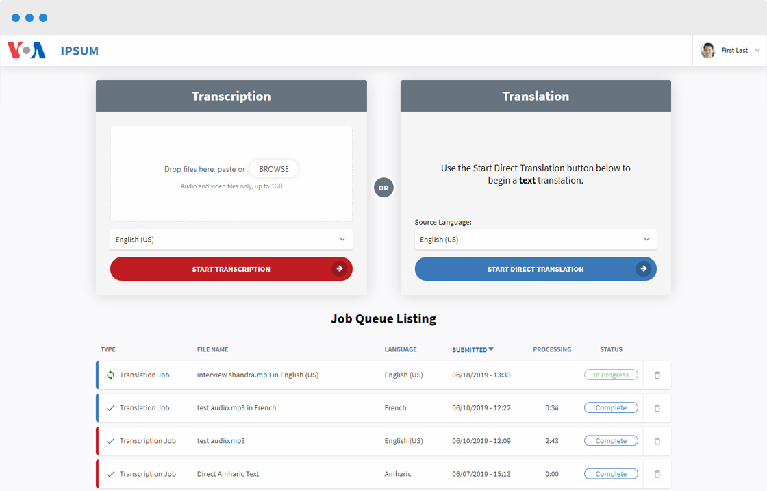 The Voice of America (VOA) broadcasts about 1,800 hours of radio and television each week to a global audience of over 236 million people in 47 languages. VOA also publishes to a variety of digital platforms including mobile, Facebook, Twitter, and YouTube. WebFirst created a user friendly interface by which audio interviews can be uploaded, transcribed and translated into one of over 140 languages. The best fit for translation engines are determined on the fly using a AI system.